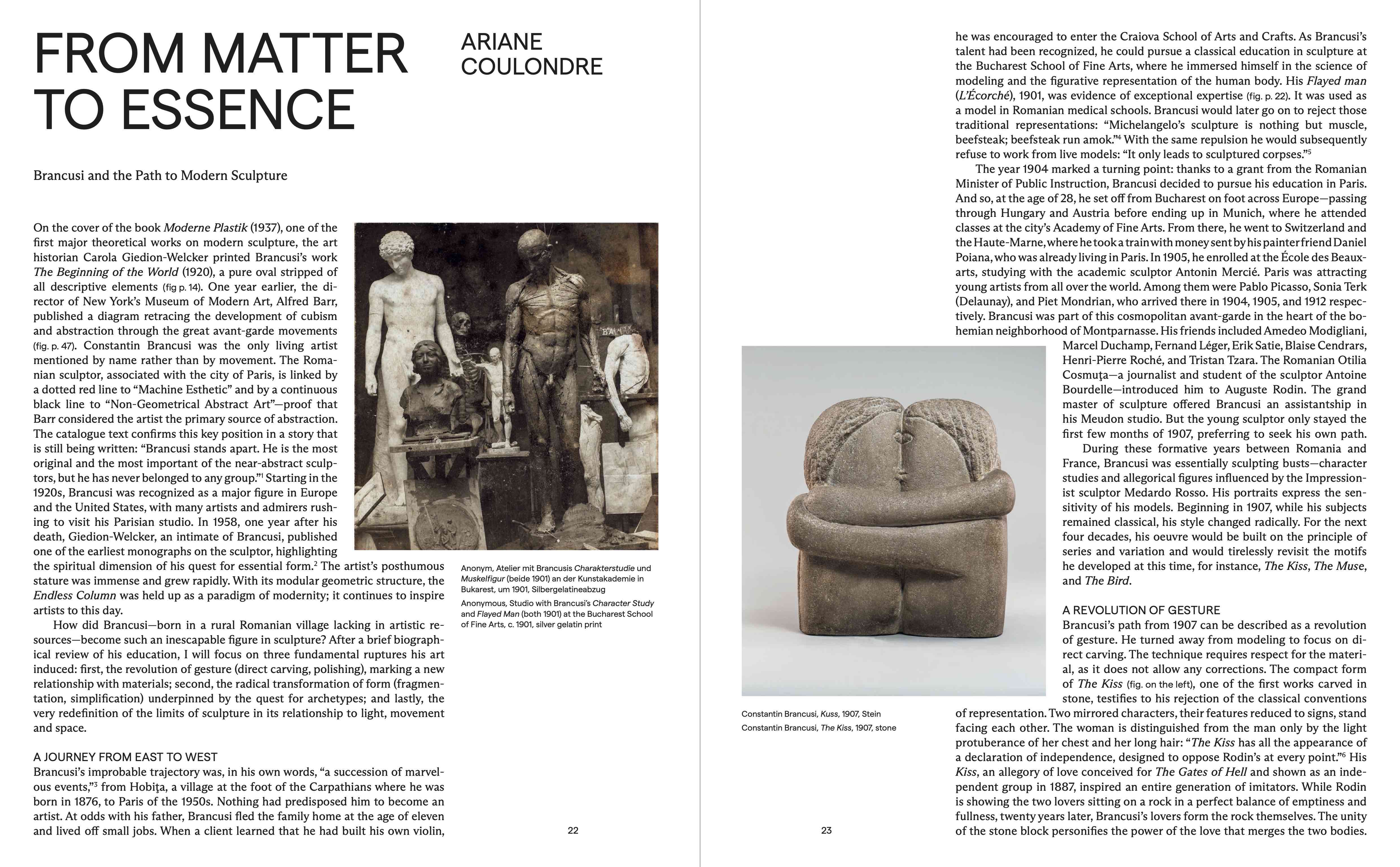 Anlässlich der Retrospektive in der Neuen Nationalgalerie in Berlin – in Kooperation mit dem Centre Pompidou in Paris – erscheint der umfassende Katalog, der die vielfältigen Facetten von Brancusis Œuvre beleuchtet: Zahlreiche seiner Hauptwerke aus internationalen Sammlungen werden darin ebenso dargestellt wie Einblicke in sein Atelier. Fotografien des Künstlers aus seinem Nachlass ergänzen den umfangreichen Bildteil. Mit einer Einführung von Ariane Coulondre sowie weiteren Essays von Nina Schallenberg zur zeitgenössischen Inszenierung seiner Werke und Maike Steinkamp zur Rezeption von Brancusi in Europa.