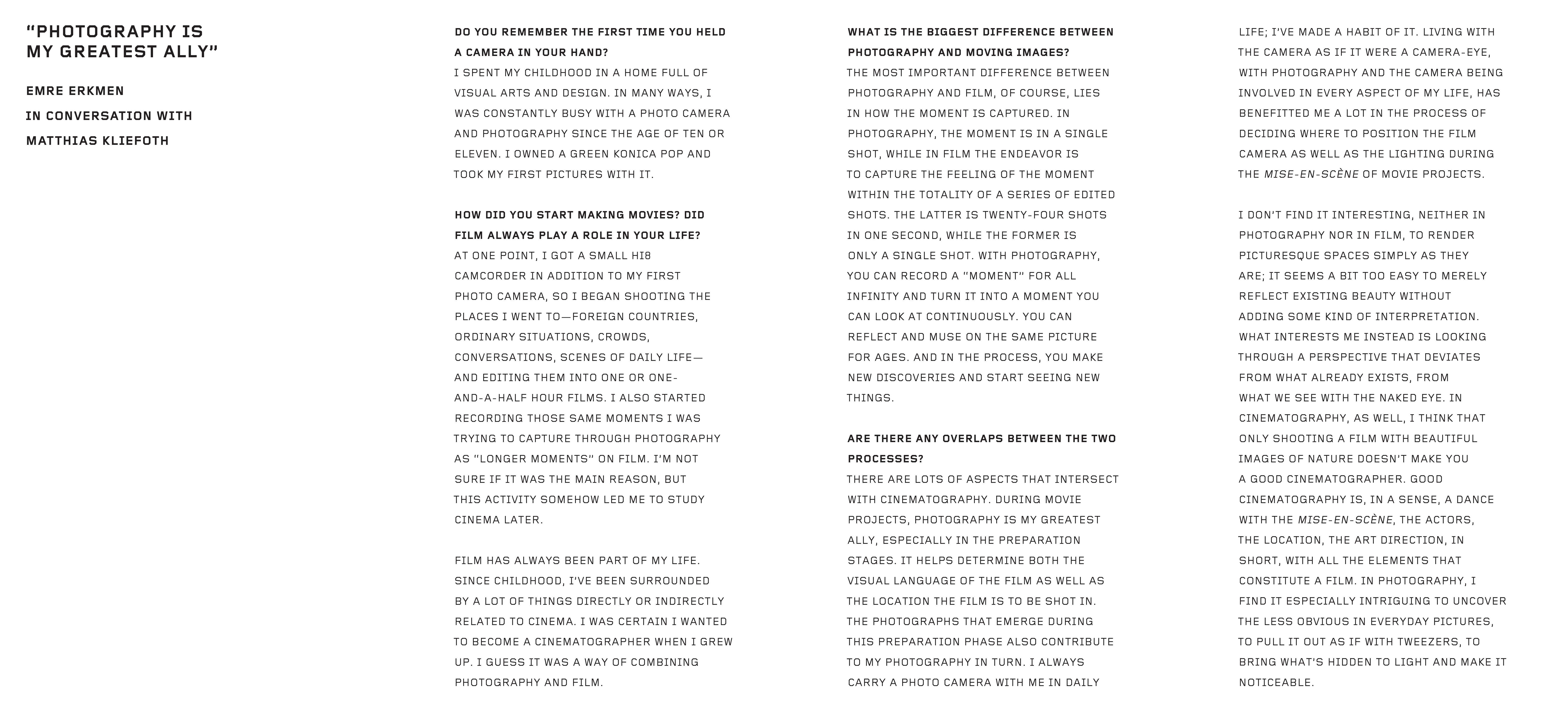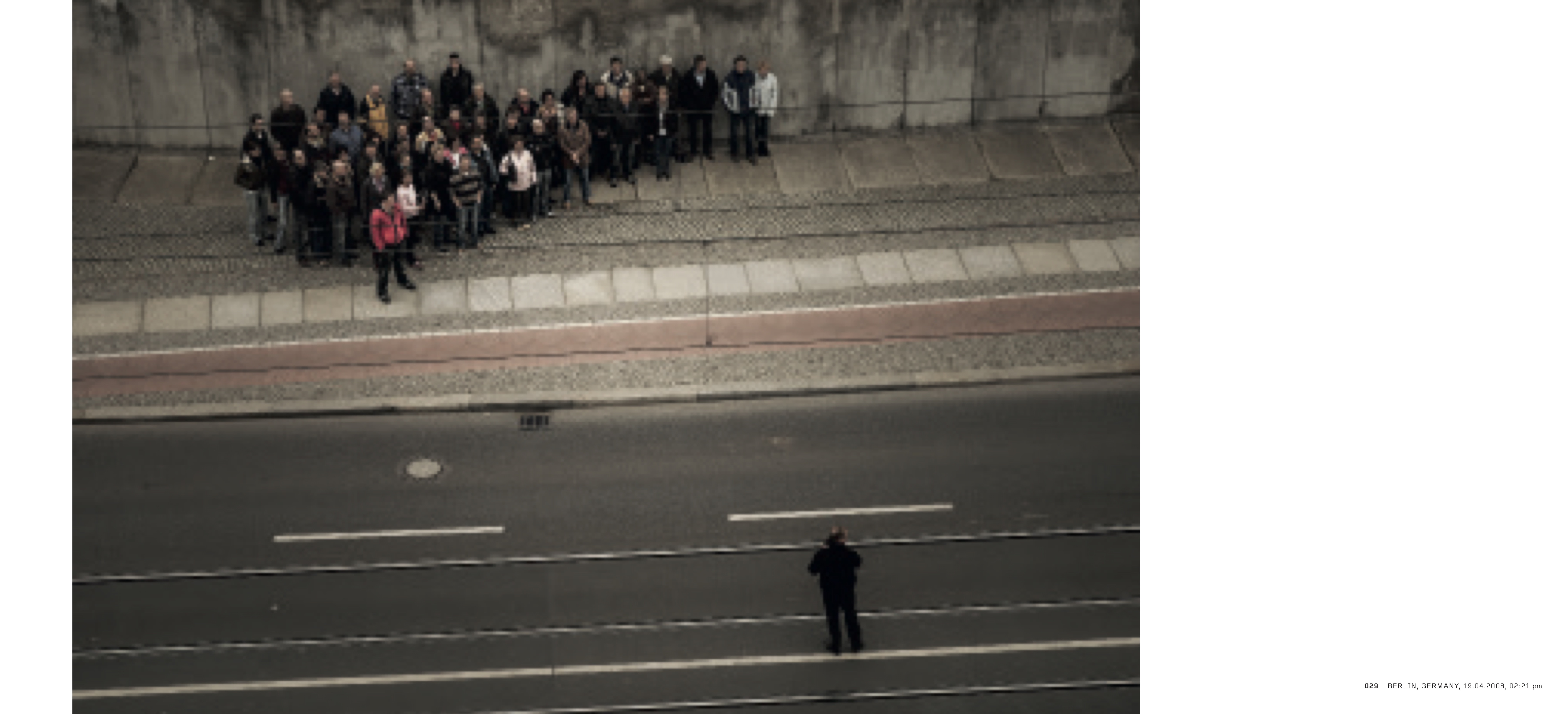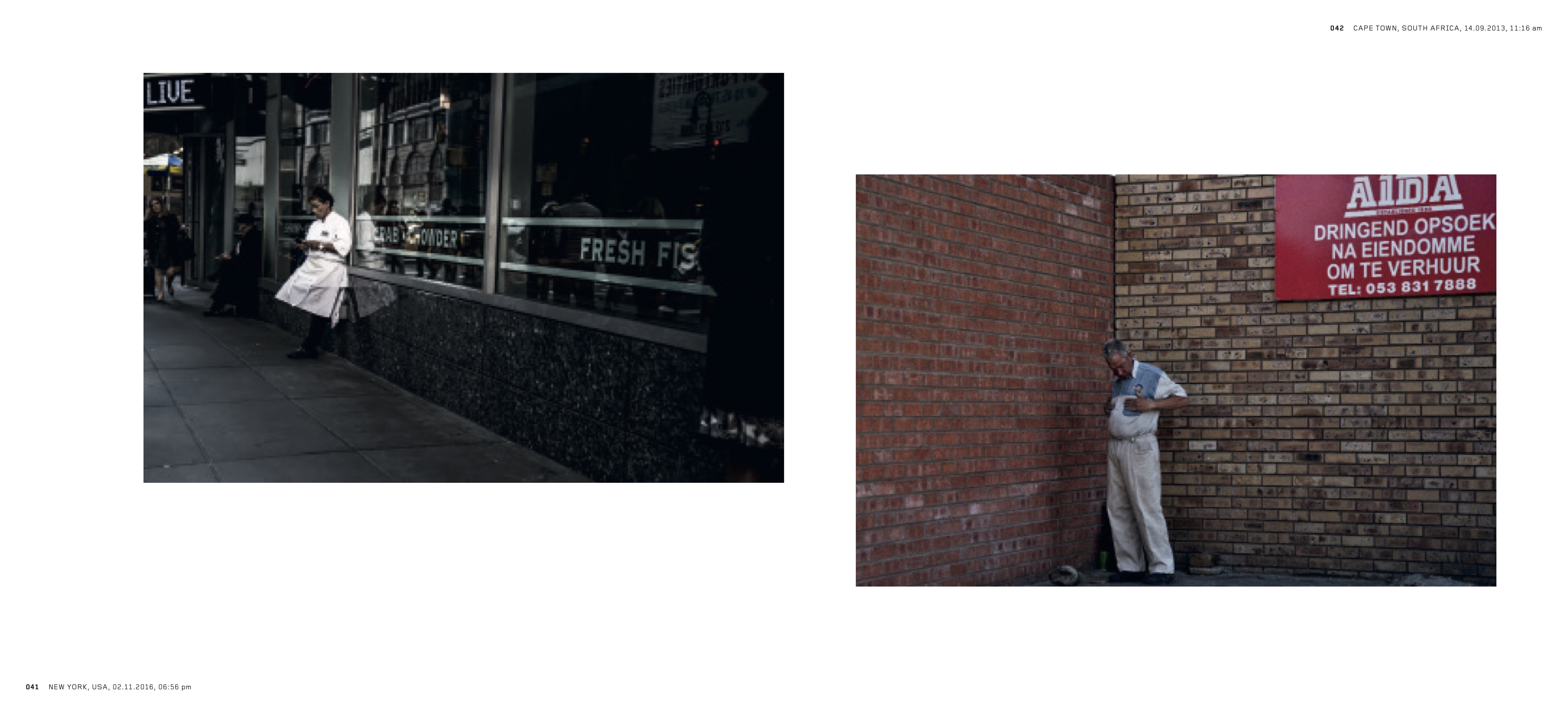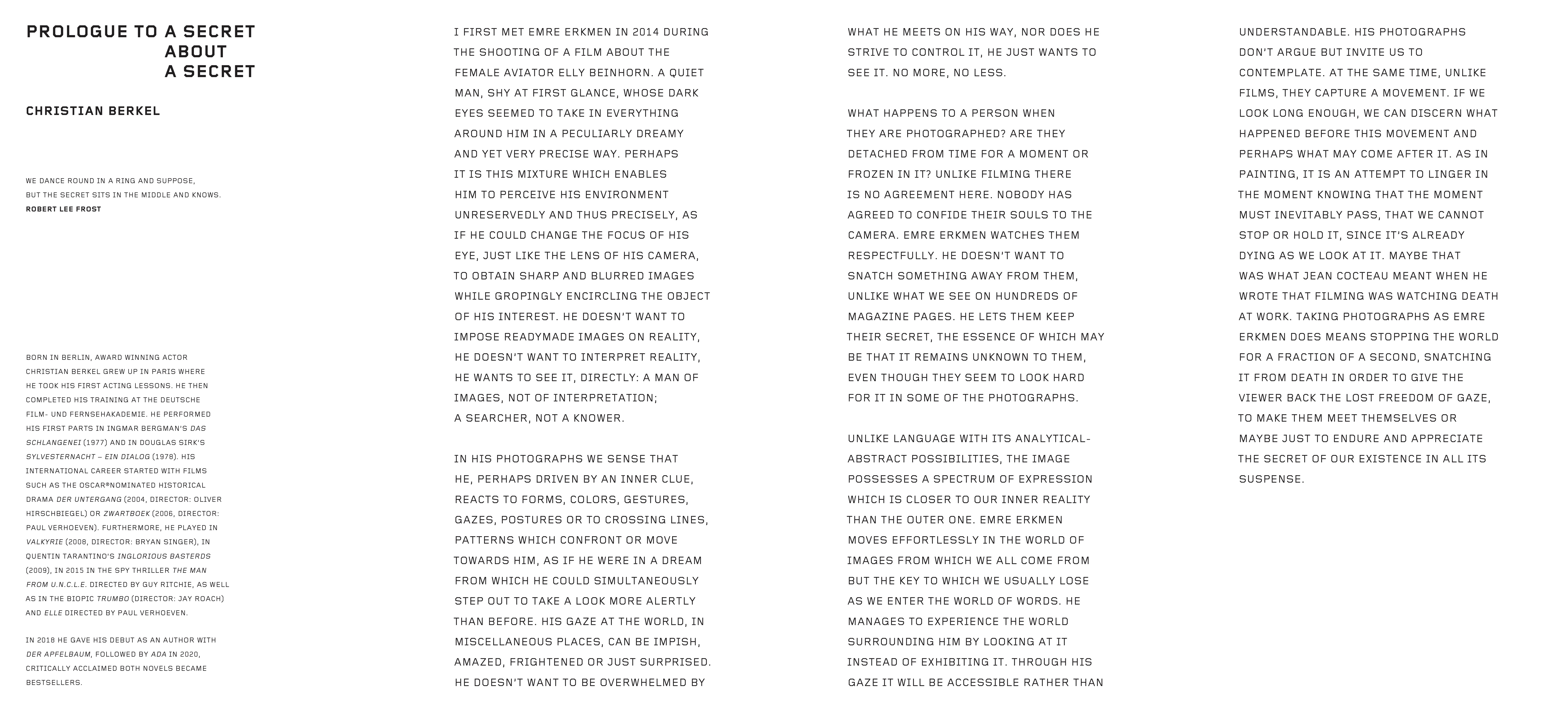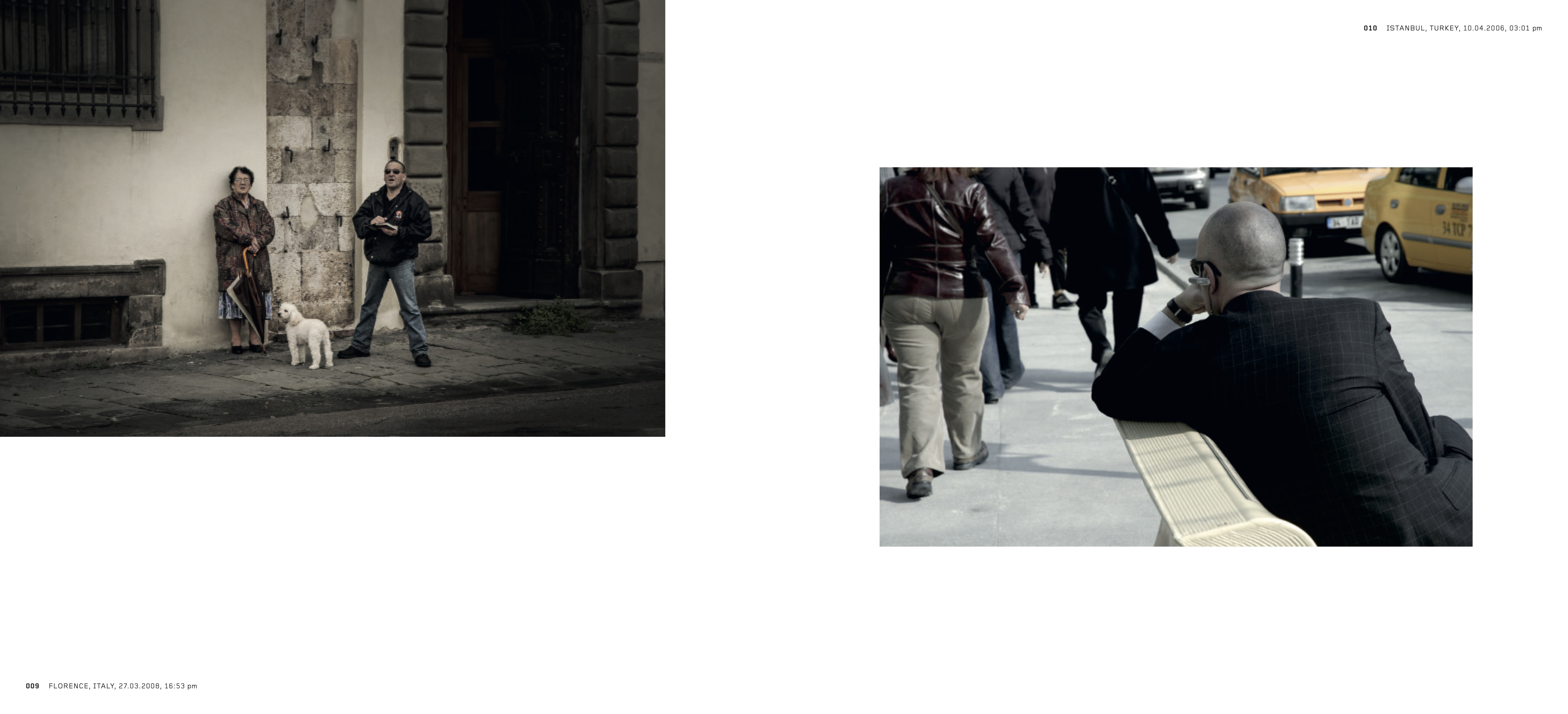 Die Fotografien von Emre Erkmen (geb. 1975 in Istanbul; lebt und arbeitet in Berlin und Instanbul), der eigentlich erfahrener Kameramann ist, spiegeln seine ausgesprochene Sensibilität für das Sujet wider. In seinem ersten Fotobuch stellt er Bilder der ländlichen und städtischen Räume und des Lebens an diesen Orten einander gegenüber. Die Fotografien entstanden während Filmdrehs und sind in Sequenzen angeordnet, die an Filmstreifen auf Celluloid erinnern und die städtischen und ländlichen Umgebungen kontrastieren – von Amerika bis Asien, über die Türkei, der Heimat Erkmens, bis nach Westeuropa.