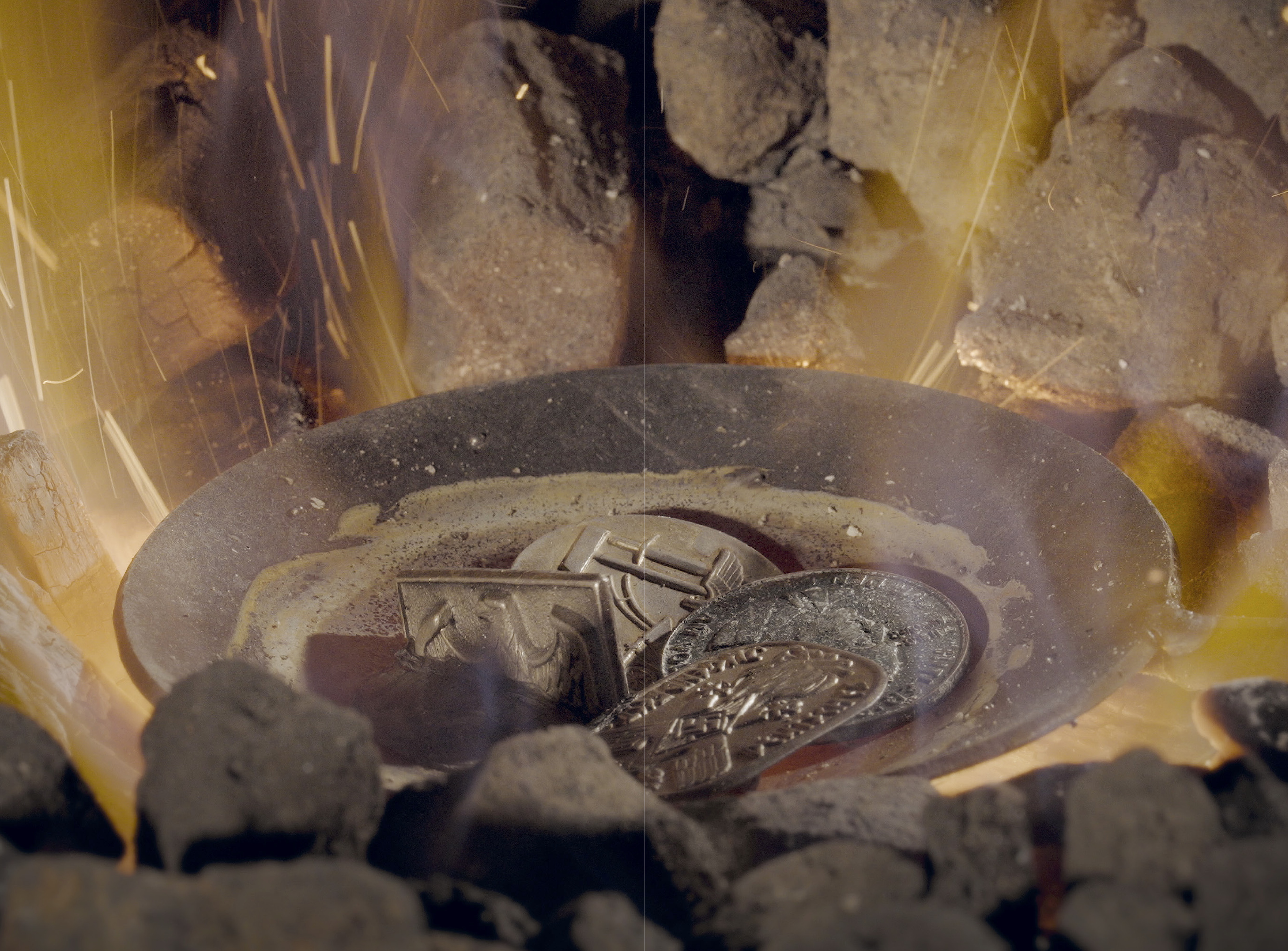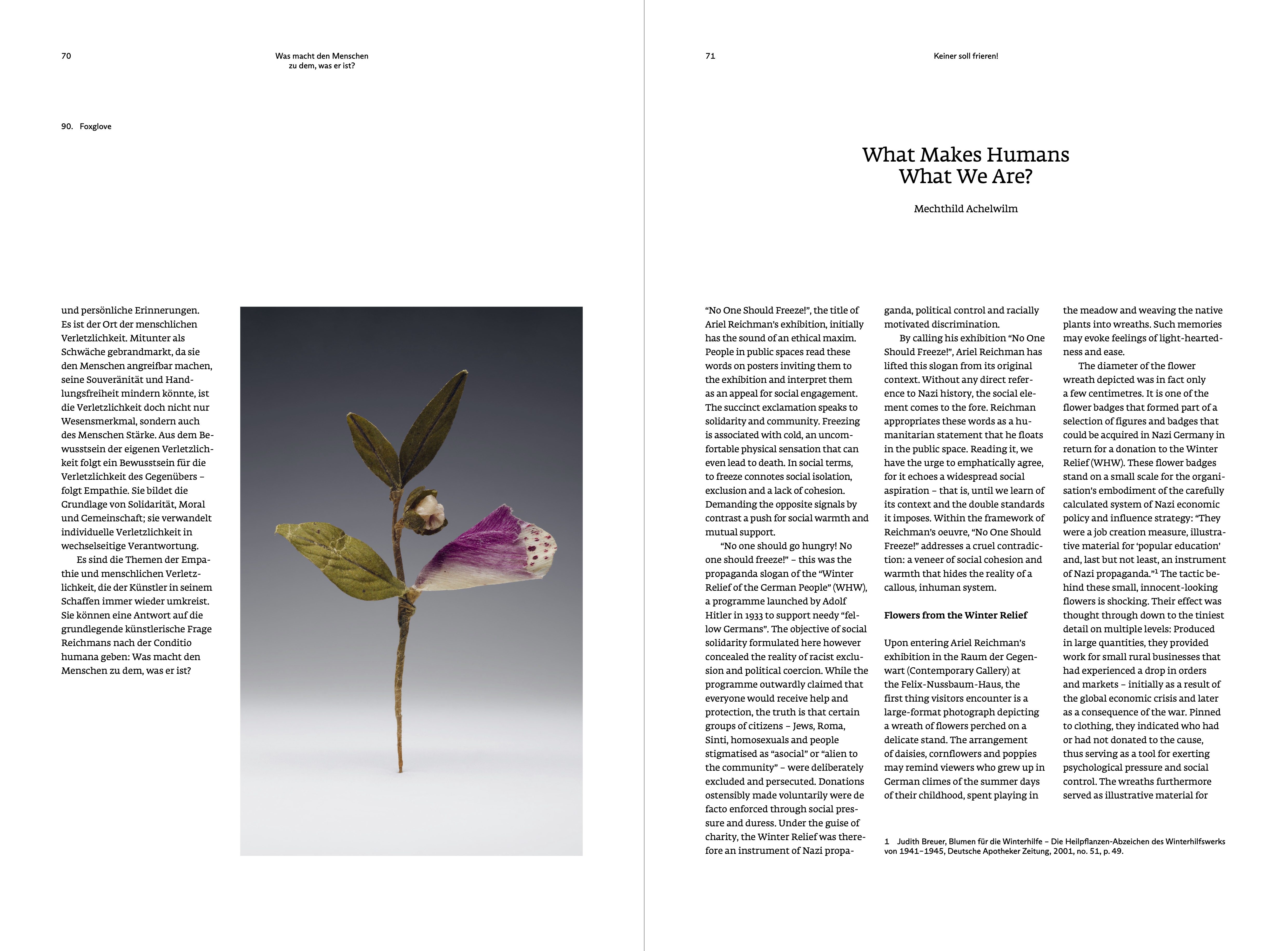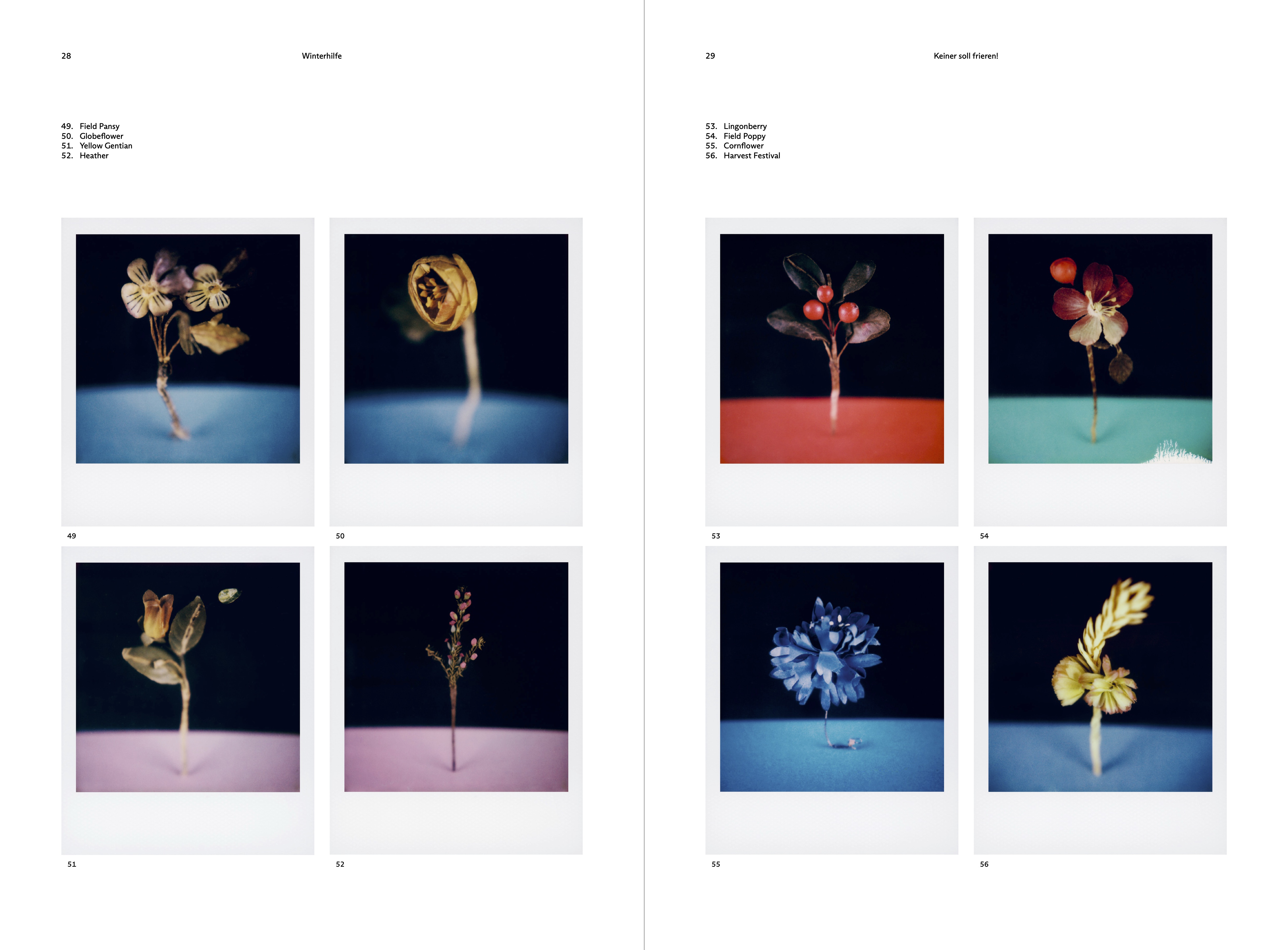 Ariel Reichman (b. Johannesburg, 1979; lives and works in Berlin) combines photography, film, sculpture, and installation art in complex immersive experiences in which he explores themes of human vulnerability and empathy. When Reichman stumbled over Nazi memorabilia on a flea market, he felt the need to remove them from circulation. For his most recent project, he started buying Nazi-era metal objects on online platforms, melting them down, and casting them into new shapes. In this context, Reichman also came across the “Winter Relief of the German People,” a program launched by Adolf Hitler in 1933, and examined the propagandistic fundraising campaign promoted under the slogan “No one shall be hungry, no one shall freeze!”. Small floral badges that donors received in recognition of their contribution are reproduced in the publication as polaroids, their blend of innocuous beauty and brutal calculation creating a deeply unsettling effect.