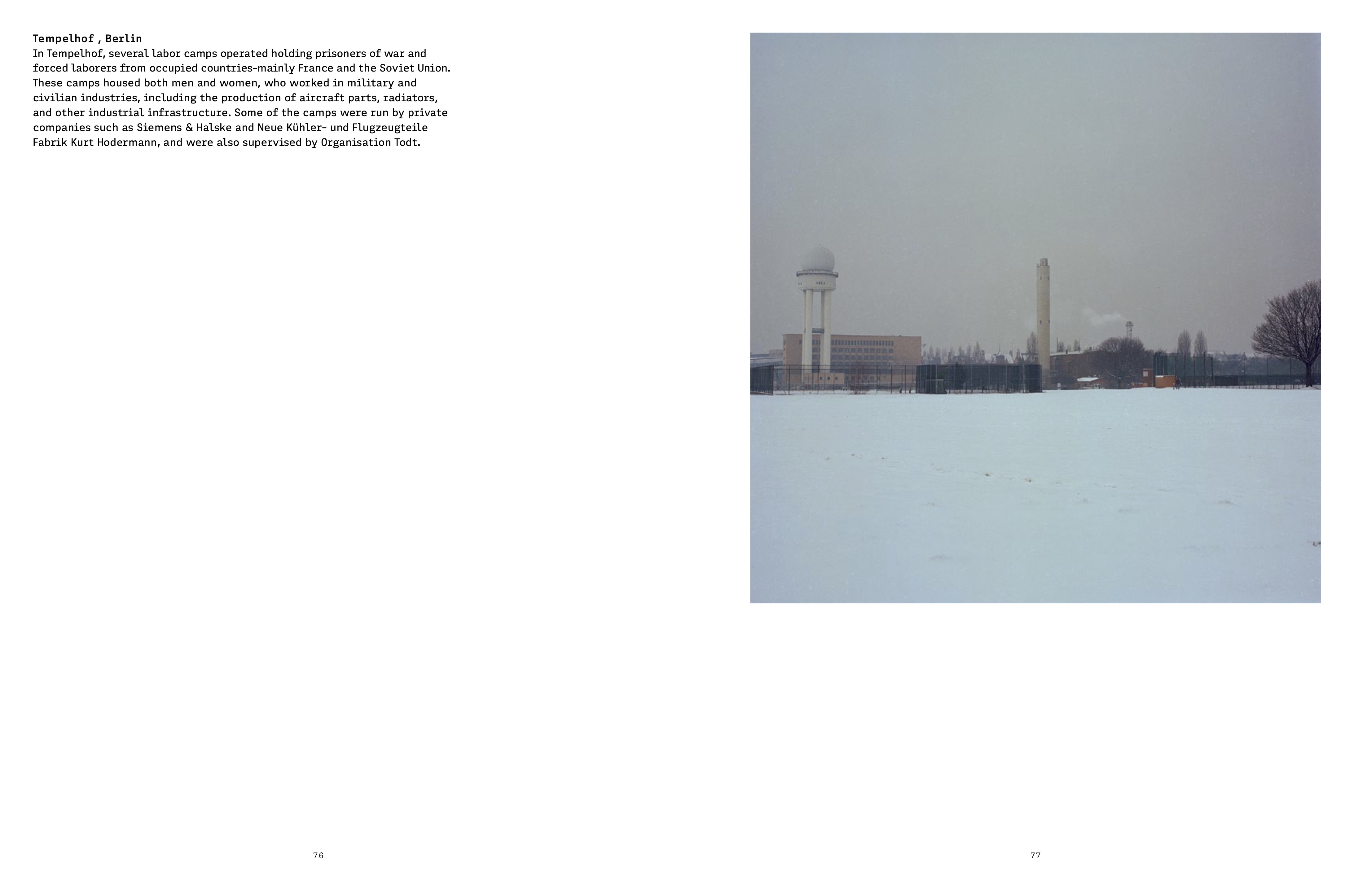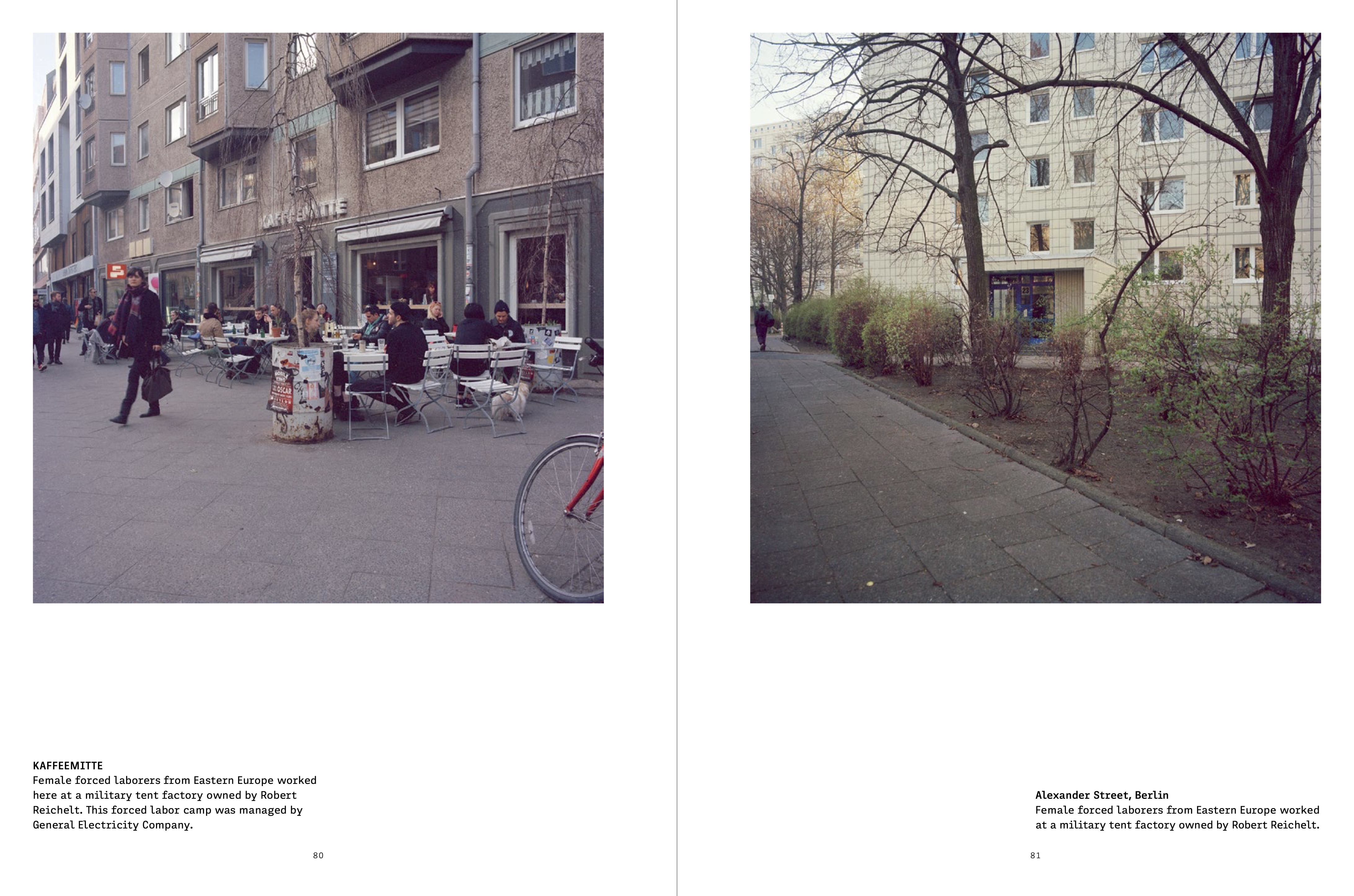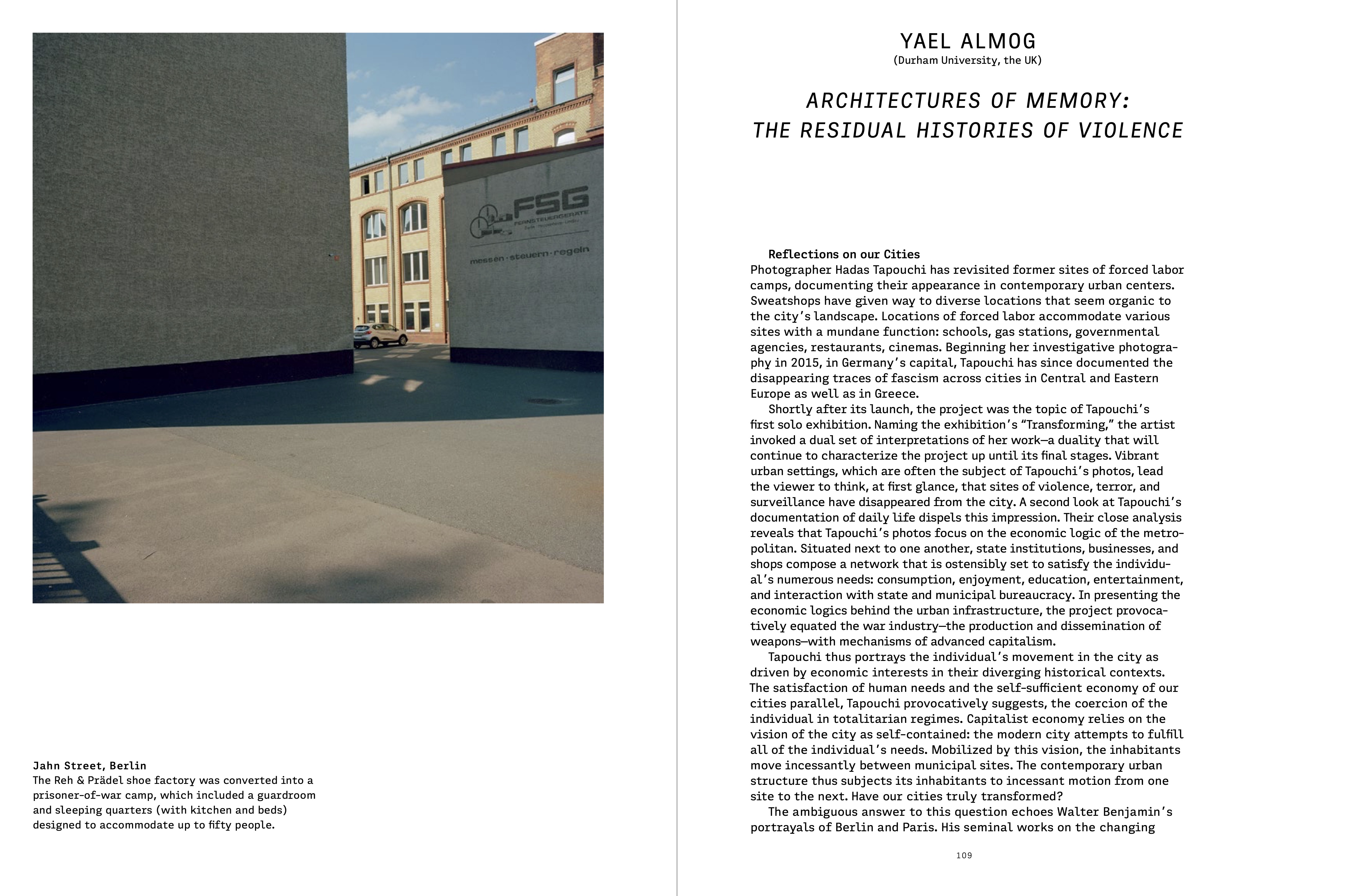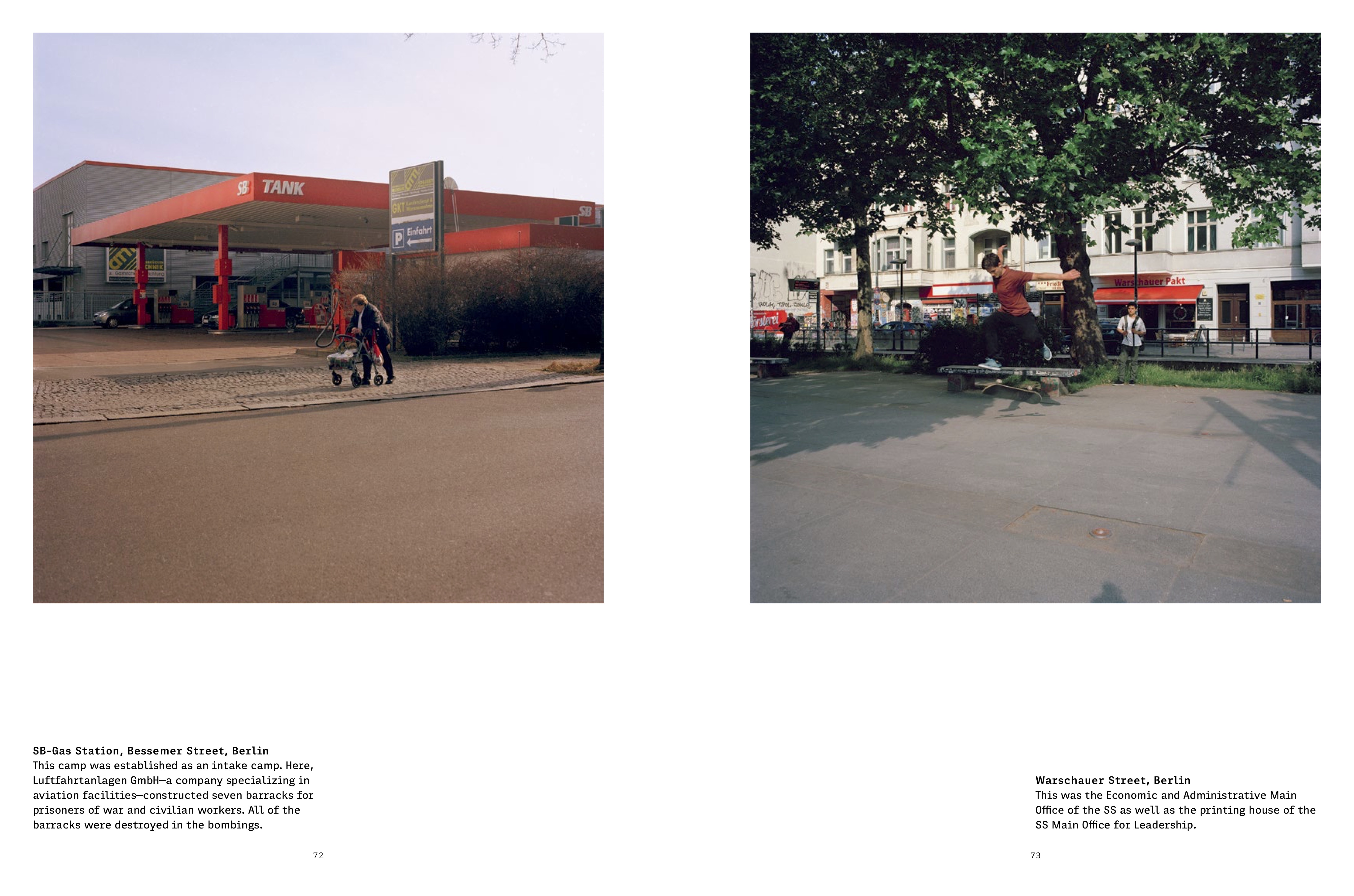 For her new book project Memory Practice, Tapouchi visited the settings of World War II–era crimes and captured their contemporary appearance in discreet photographs. Her pictures reveal how industrial installations where the Nazis used forced labor and other sites of atrocities have been repurposed and now seem to blend seamlessly into the surrounding cityscape. These places—schools, gas stations, public offices, restaurants, cinemas—often serve perfectly ordinary functions today, but their histo- ric significance lingers beneath the surface. Tapouchi’s work asks: Which processes of normalization can be detected? How has the anguish caused by violence, coercion, and surveillance become imprinted on contemporary urban and social structures? Or how are such traces covered up, leaving blanks in the collective recollection? The artist has documented these vanishing traces in Berlin and cities and towns across Central and Eastern Europe and Greece since 2014.