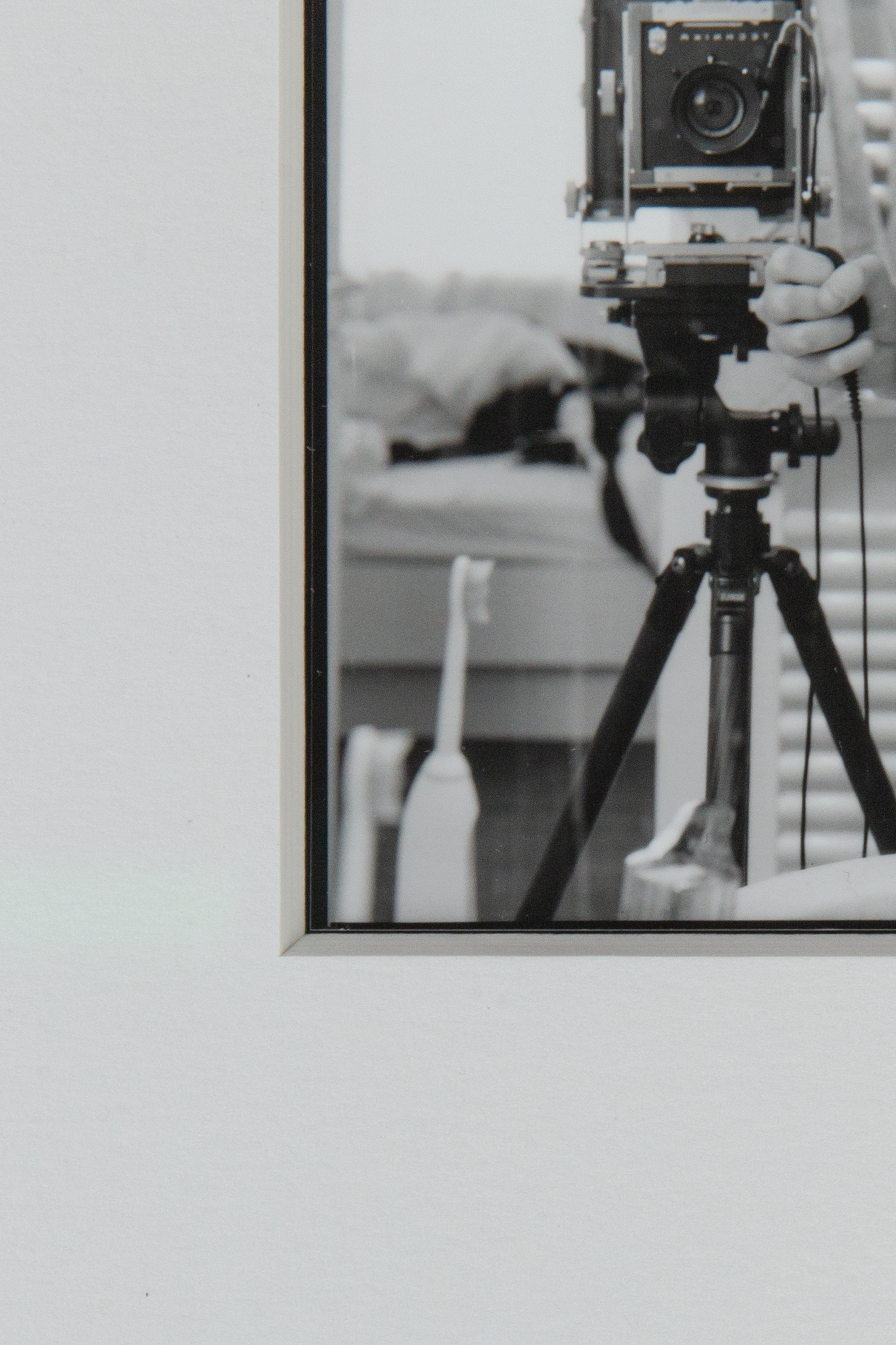 Her self-portrait Ufer, 17-27.02.2019 – 13-14.11.2022, CWLJMK is part of the ongoing series After Hours, in which Sophie Thun photographs herself in hotel rooms while traveling for commercial photo jobs. She thus draws attention to relations of economic dependency and hierarchical structures in the contemporary art industry. In this image, Thun’s expression alternates between vulnerability and determination. Alongside the nude artist, it also shows her camera, the apparatus with which Thun captures and situates herself and her role as an artist in today’s art system.