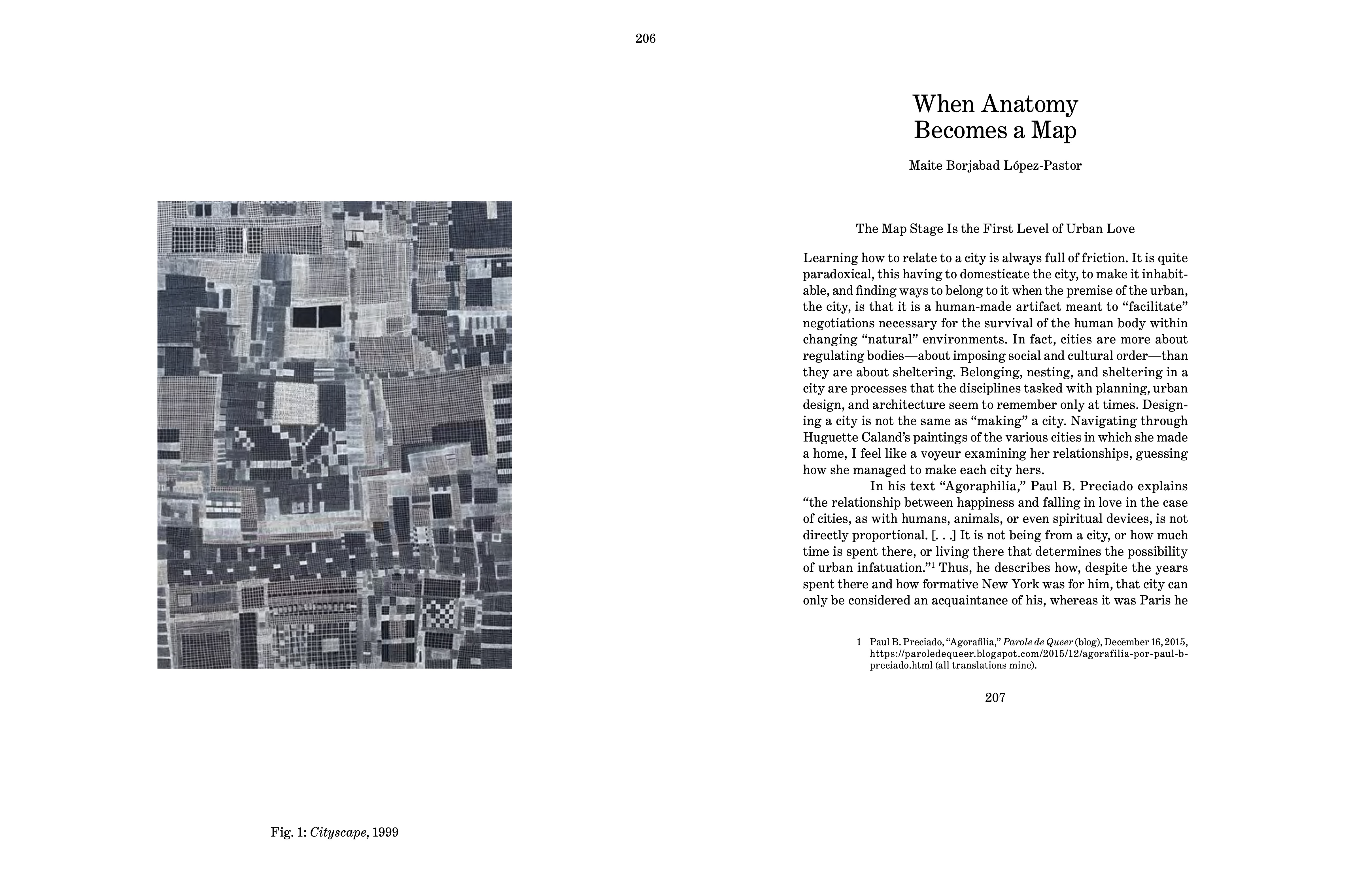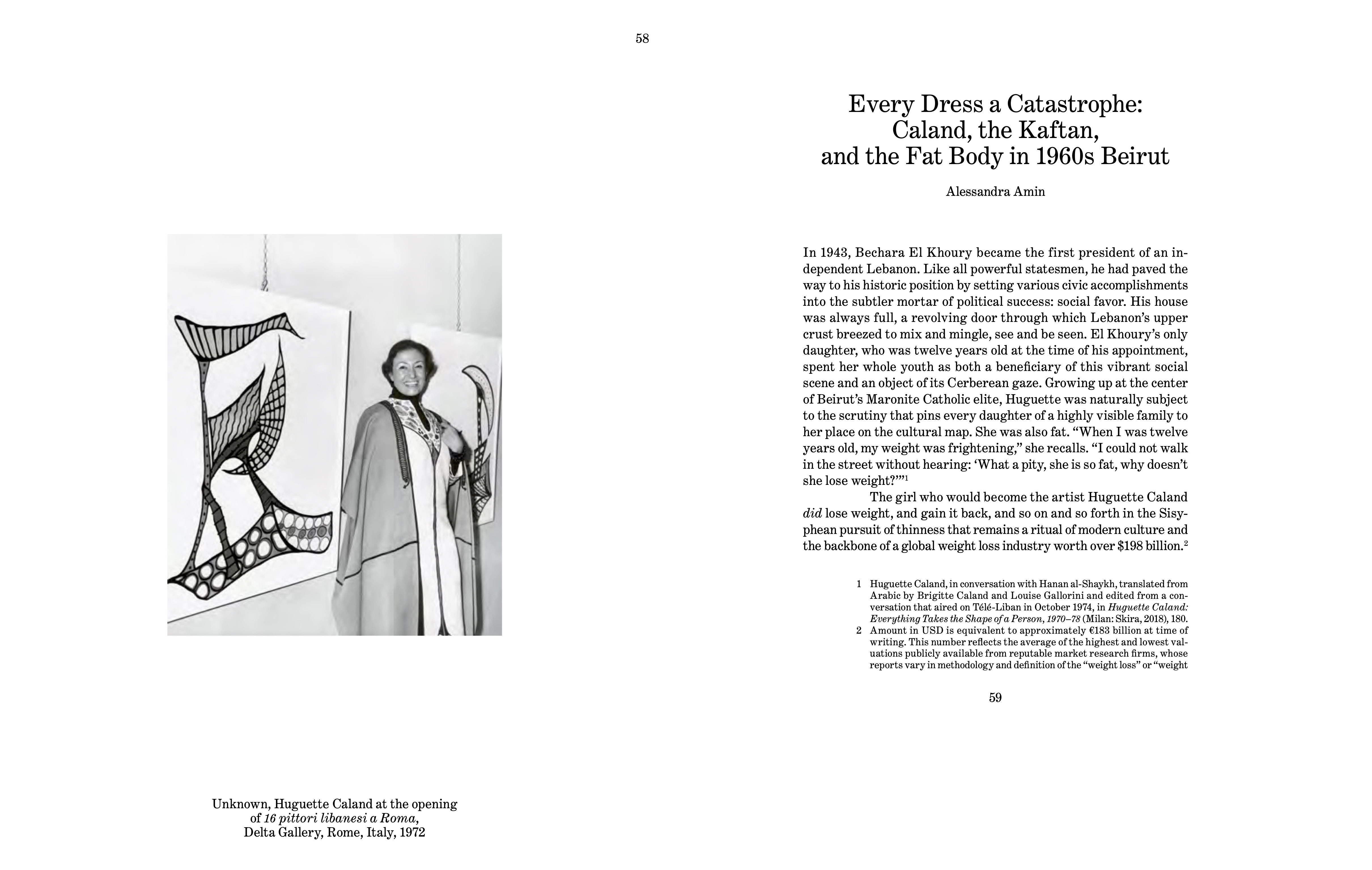 Die libanesische Künstlerin Huguette Caland (1931–2019) widersetzte sich in ihrer fast fünfzigjährigen Karriere konsequent den gesellschaftlichen und ästhetischen Erwartungen ihrer Zeit. Ihr vielschichtiges Lebenswerk ist geprägt von einem Leben zwischen verschiedenen Kulturen und Orten. Caland wuchs in Beirut als Tochter des ersten Präsidenten des Libanon auf, verließ ihre Familie und verbrachte die 1970er- und 1980er-Jahre in Paris, zog 1987 nach Venice (Los Angeles) und kehrte erst 2013 nach Beirut zurück. In Gemälden, Zeichnungen, Skulpturen und Textilien stellt sie traditionelle Darstellungen von Sexualität, Körper und Begehren infrage. Zwischen Figuration – bisweilen explizit erotischen Motiven – und Abstraktion changierend, entwickelte die Künstlerin ihr charakteristisches Alphabet aus Kurven, Schlitzen, Ausbuchtungen und Grübchen, mit dem sie ihrer Zeit voraus war.