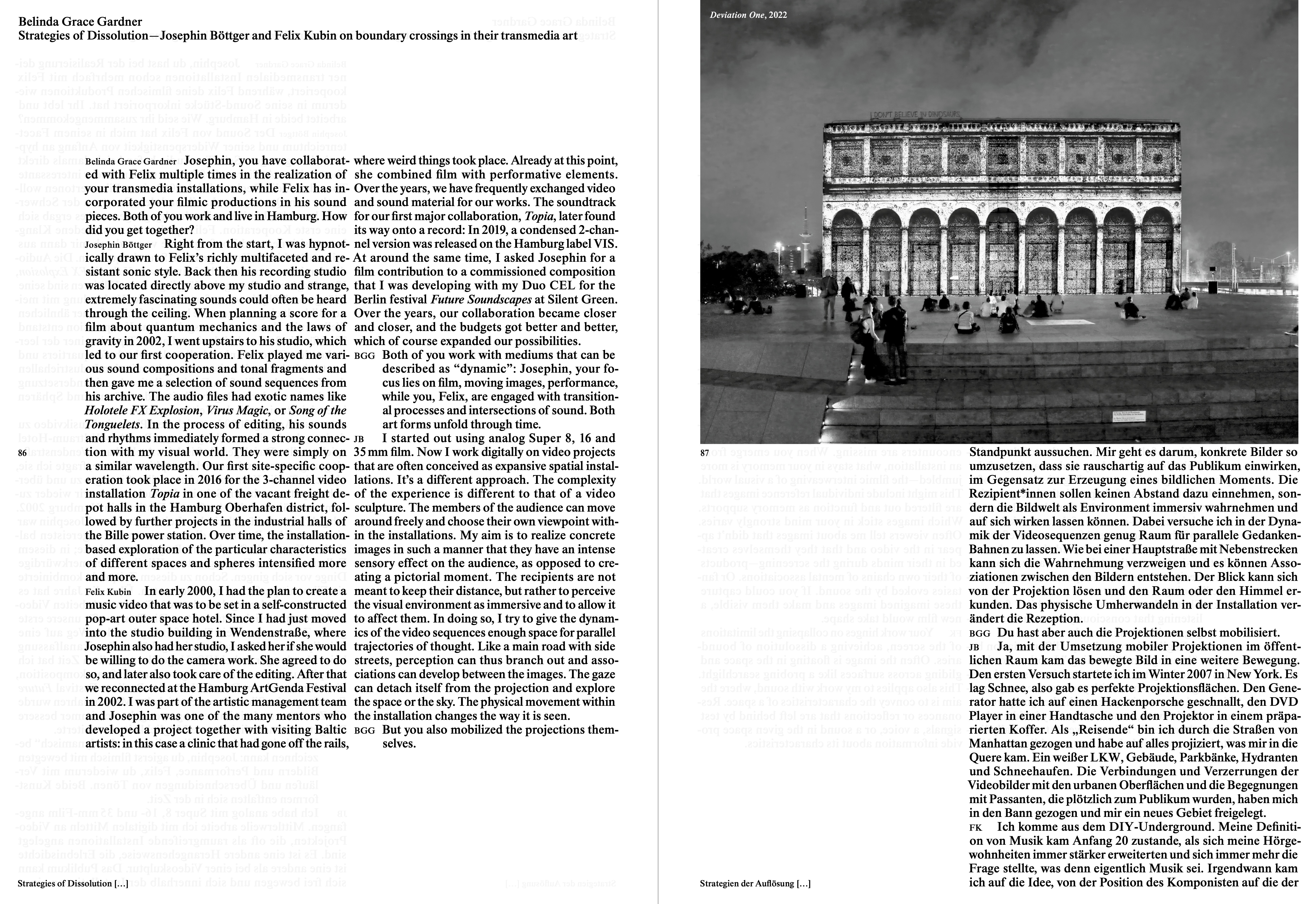 Deviations befasst sich mit der temporären Verwandlung öffentlicher Räume durch Josephin Böttgers performative und audiovisuelle Interventionen. Mit Beiträgen von Belinda Grace Gardner, Matthew Partridge, Ifee Tack, Felix Kubin und der Künstlerin.