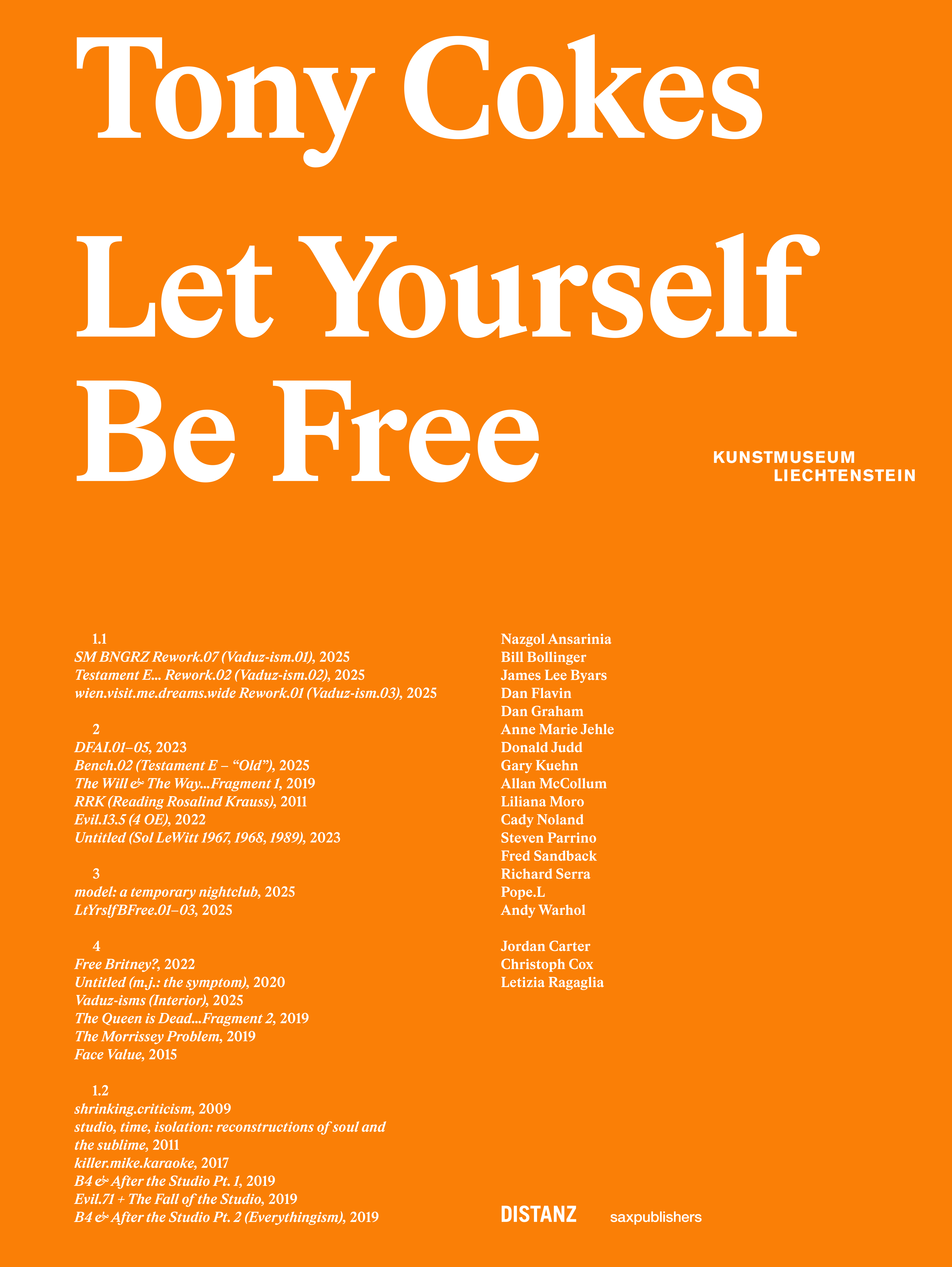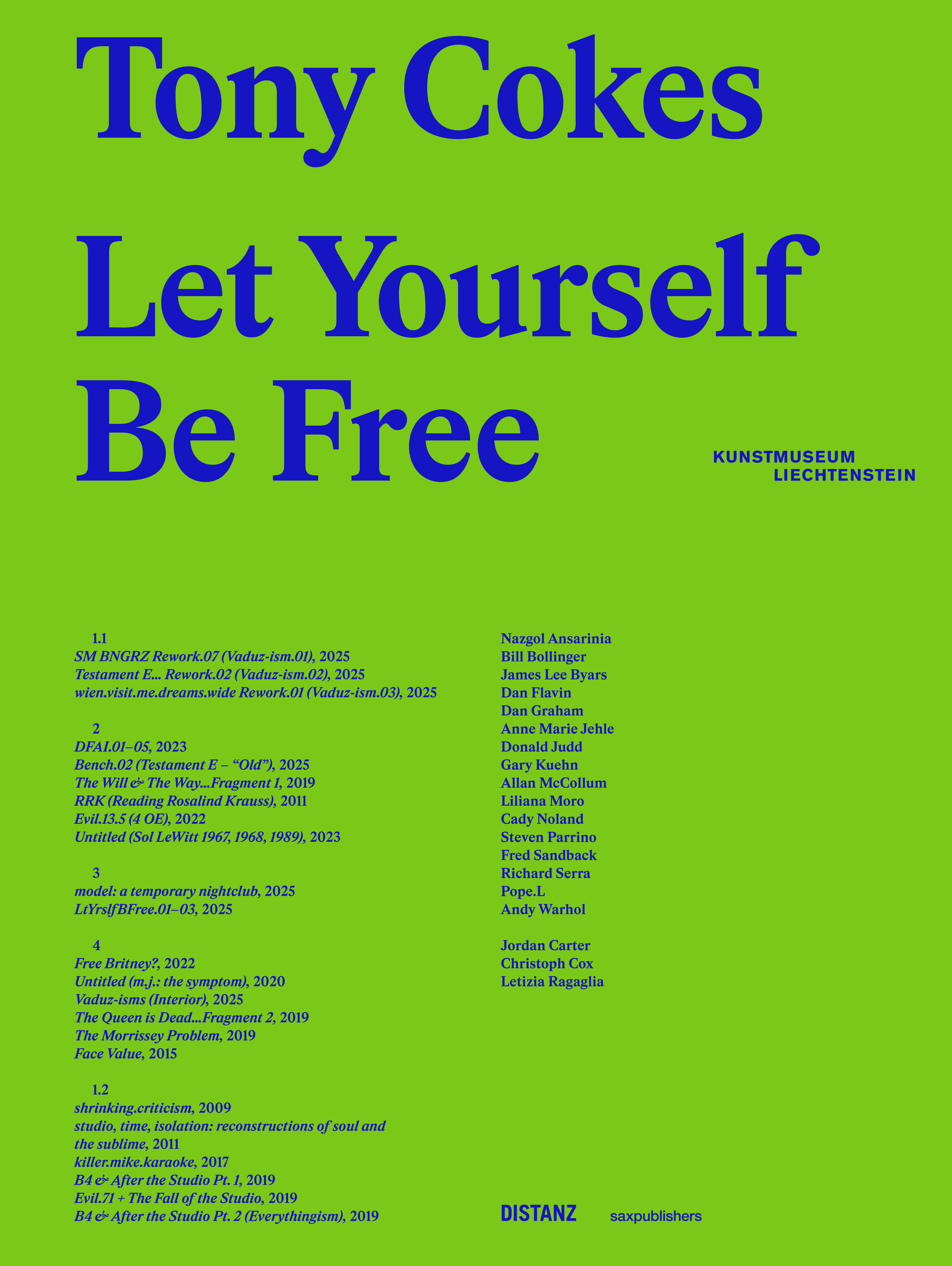 Der Katalog Let Yourself Be Free erscheint im Rahmen von Tony Cokes Einzelausstellung im Kunstmuseum Liechtenstein. In der Ausstellung tritt Cokes mit Werken aus der Sammlung in einen Dialog. Das Prinzip des Sampelns und Mixens wird von Cokes auch im Katalog aufgegriffen. Ein programmierter Algorithmus macht jedes Buch zu einem Unikat, da mithilfe dieser Schnittstelle im Druckprozess Bilder, die Cokes Videoessays zu unterschiedlichen Zeitpunkten dokumentieren, je Exemplar variiert werden. Die Textbeiträge schrieben Jordan Carter (Dia Art Foundation) und Christoph Cox (Eugene Lang College of Liberal Arts, The New School, New York). Außerdem enthält die Publikation ein ausführliches Interview zwischen Letizia Ragaglia (Kunstmuseum Liechtenstein) und dem Künstler. Das experimentelle Katalogprojekt wird mit saxpublishers co-verlegt.